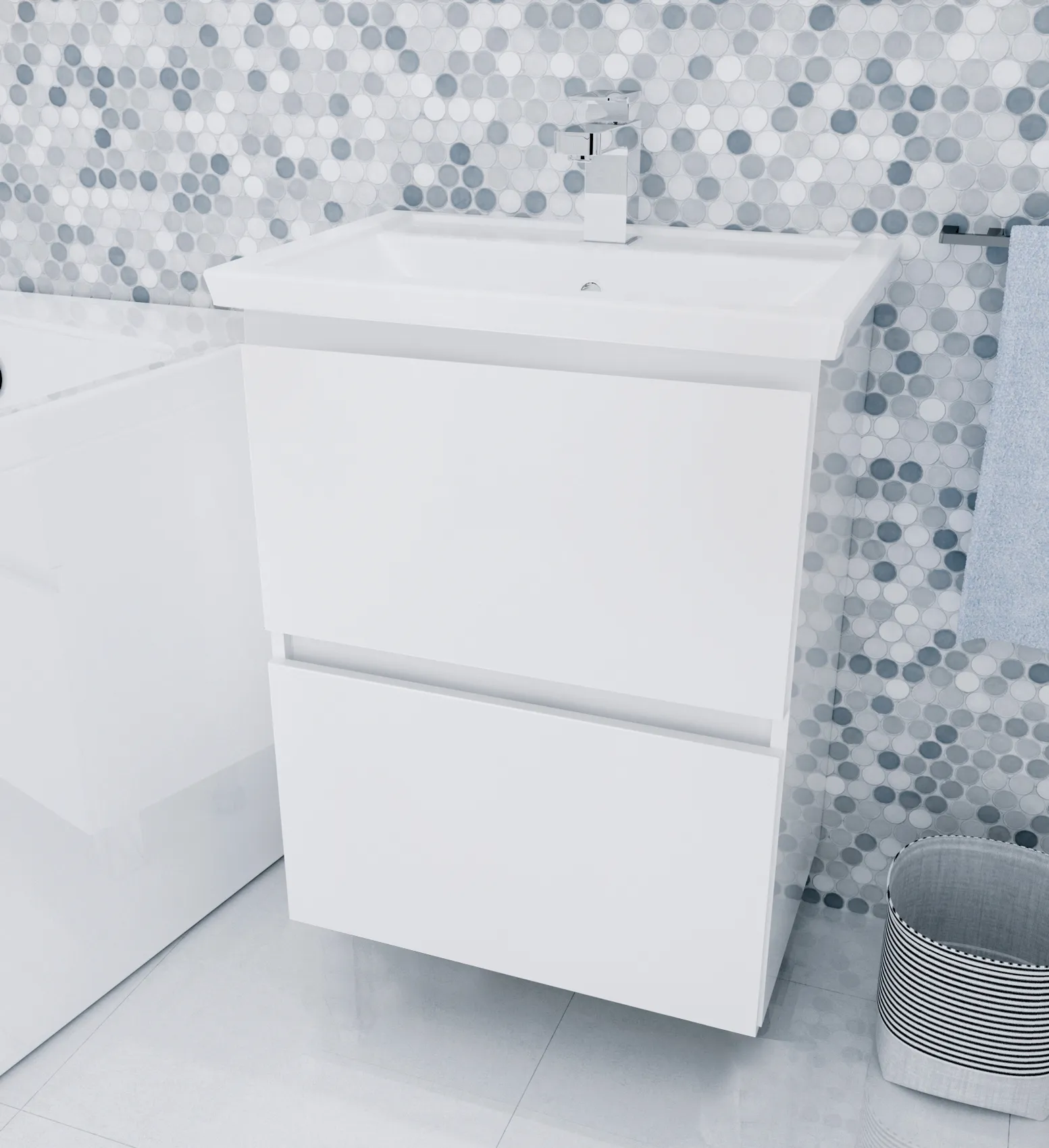 Стильная и лаконичная тумба для ванной комнаты, в дизайне которой нет ничего лишнего - только минимализм и акцент на безоговорочную функциональность. Отсутствие ручек и строгие геометрические формы делают ее актуальной для интерьеров в абсолютно любой современной или эклектичной стилистике. Благодаря качественной фурнитуре ежедневное использование тумбы отличается максимальным удобством. Практичное разделение ящиков на небольшие отсеки позволяет с комфортом организовать хранение косметики и других вещей. Глянцевая белая поверхность гармонично дополнит пространства в любой цветовой гамме.Характеристики: