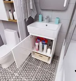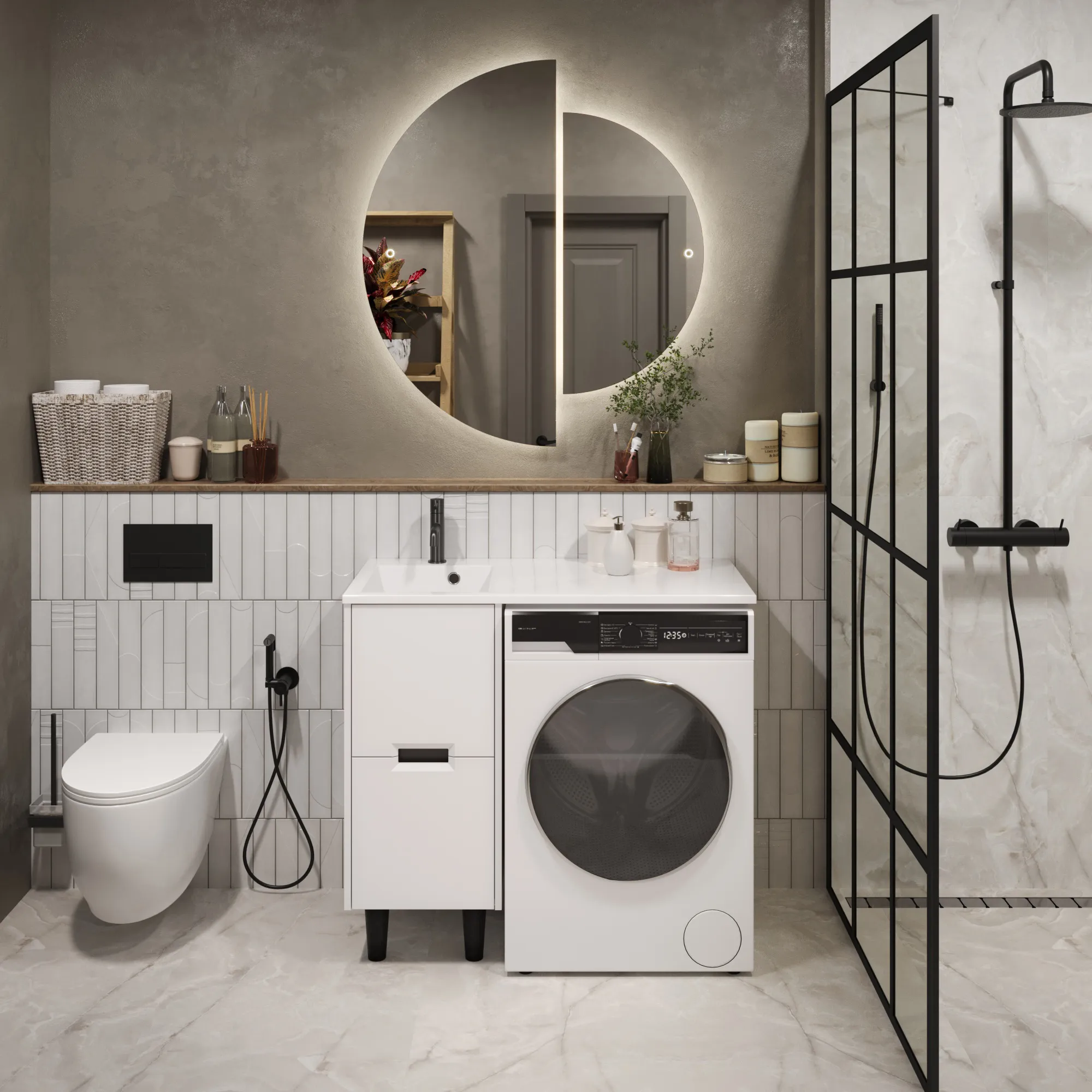 Тумба под раковину* Maid – элегантное решение "2-в-1", которое объединяет функциональность и стиль, позволяя гармонично разместить раковину и стиральную машину в ванной комнате. Белый цвет легко сочетается с другими цветами и стилями интерьера, предоставляя свободу в оформлении ванной комнаты. Акцентные опоры черного цвета гармонично дополнят ваш выбор: строгая графитовая или нежная белая раковина – для создания неповторимого стиля ванной комнаты.Характеристики: