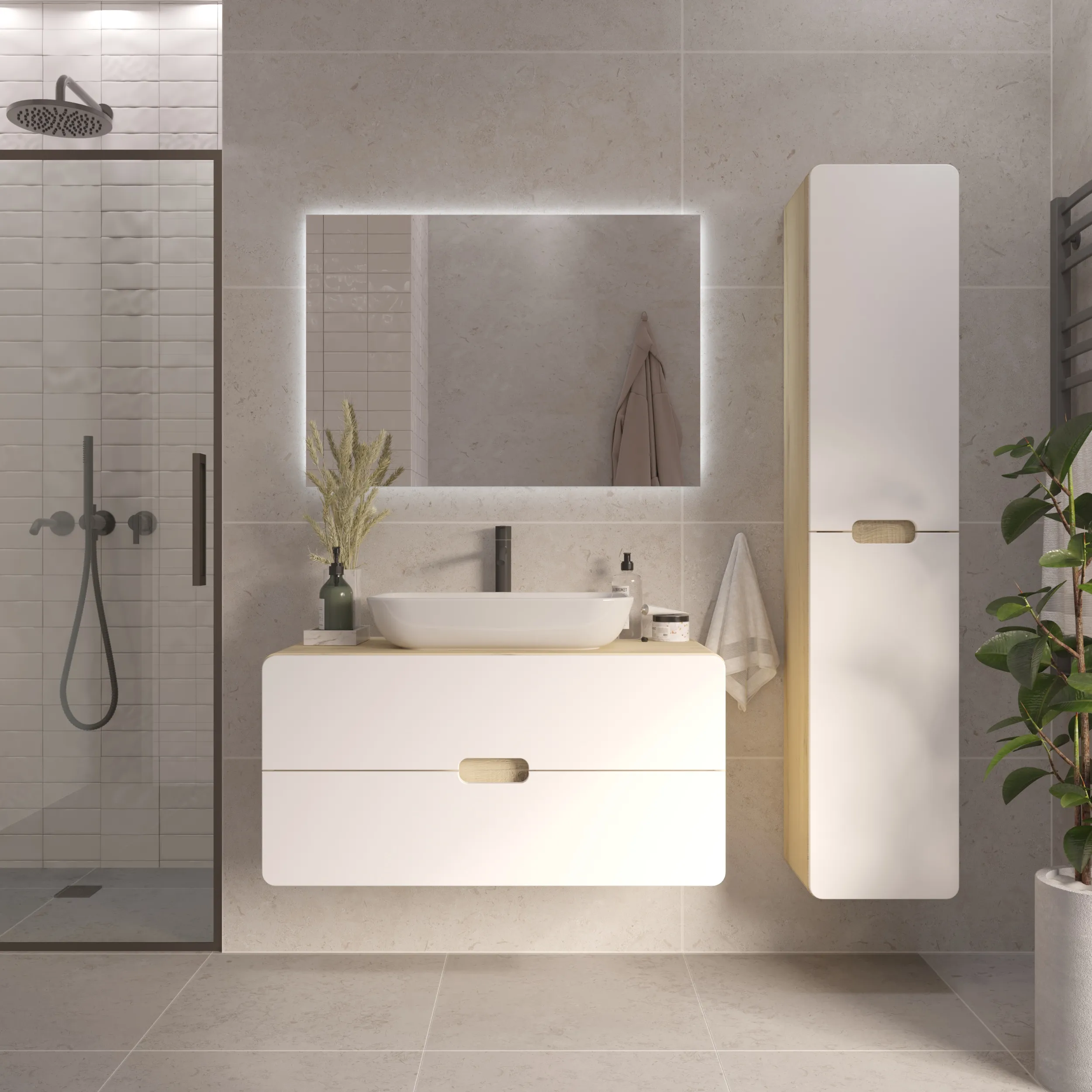 • Стильный дизайн: Элегантный белый цвет и современные стеклянные фасады добавят изысканности ванной комнате.