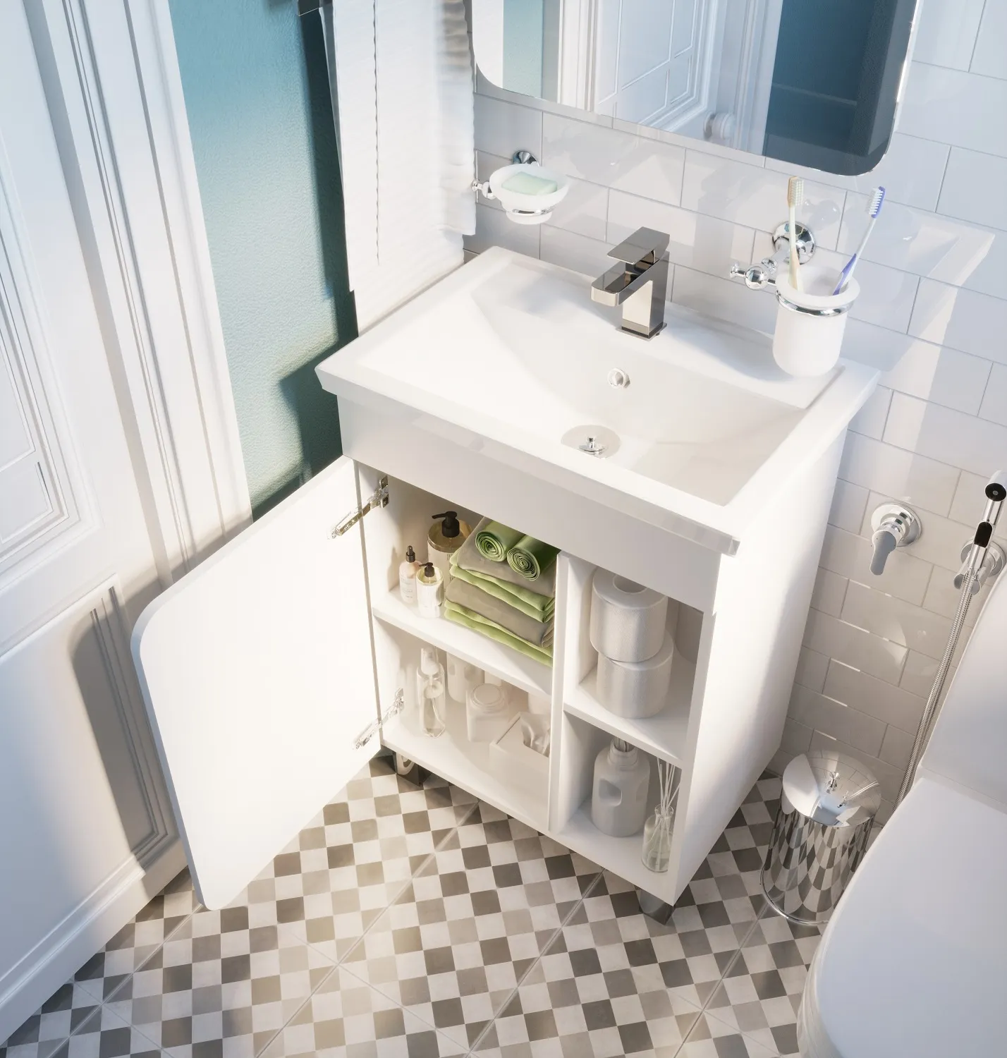Лаконичная и одновременно эффектная тумба с оригинальным контрастом материалов и сочетанием открытых и закрытых пространств для хранения. Благодаря универсальности дизайна, построенного на геометрических формах, она подойдет для ванной комнаты в любой стилистике - от традиционных до современных и эклектичных решений. Тумба позволяет максимально разгрузить окружающее пространство, сделав его не только более эстетичным, но и функциональным. Она надолго сохраняет свой привлекательный внешний вид, не требует сложного текущего ухода, а благодаря качественной фурнитуре максимально комфортна в использовании.